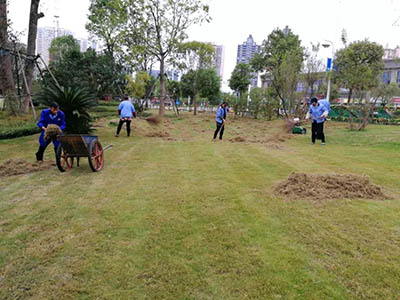 每年9-10月(日均溫低于23℃)在原有的草坪上低修剪、梳草。改善土壤透氣性,便于草籽接觸土壤、增強(qiáng)附著性。臺(tái)灣草修剪預(yù)留高度為4-5cm,百慕大為3cm。之后噴施殺菌劑,為交播創(chuàng)造良好環(huán)境。
